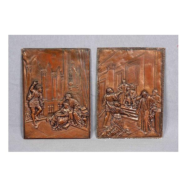 ESC. FLAMENCA, S.XVII-XVIII. “Escenas con personajes”. Pareja de bajorrelieves en cobre cincelado y repujado. Med.: 21,5x16 cm.