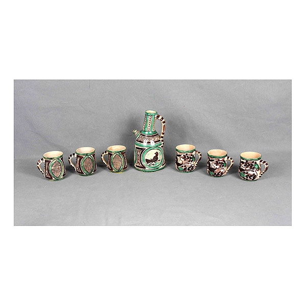 Juego de porrón y seis jarritas en cerámica GORRIZ-TERUEL, policromada y decorada con motivos geométricos y animales. Marcas en la base. Alt. porrón: 23