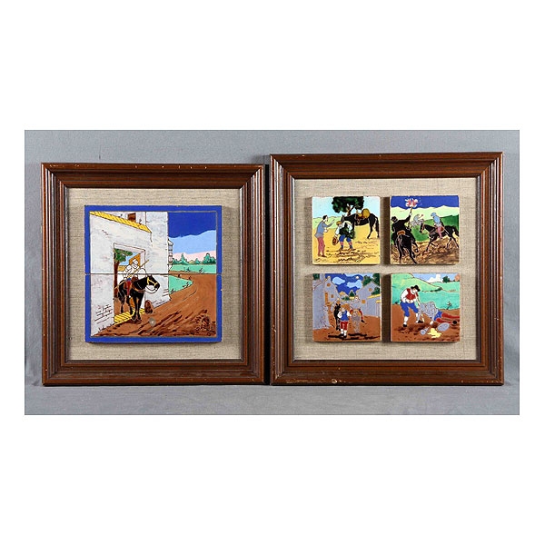 ZULOAGA, IGNACIO (1870-1945). “Escenas del Quijote”. Lote de seis azulejos en cerámica vidriada, en dos marcos.