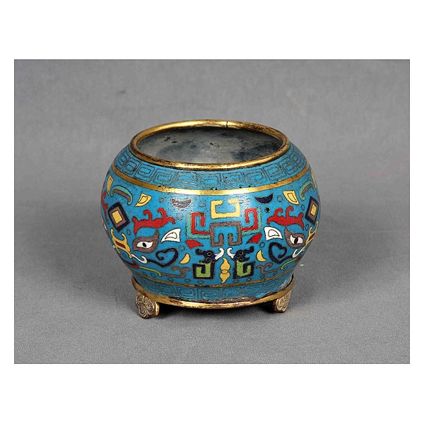 Incensario chino, S.XIX, en esmalte cloisonné y dorado, decorado con motivos geométricos y símbolos religiosos, apoyando sobre tres patas.