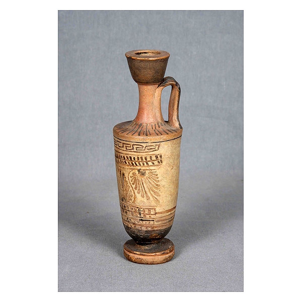 Lecito en antigua cerámica griega, policromada y decorada con motivos geométricos y vegetales.