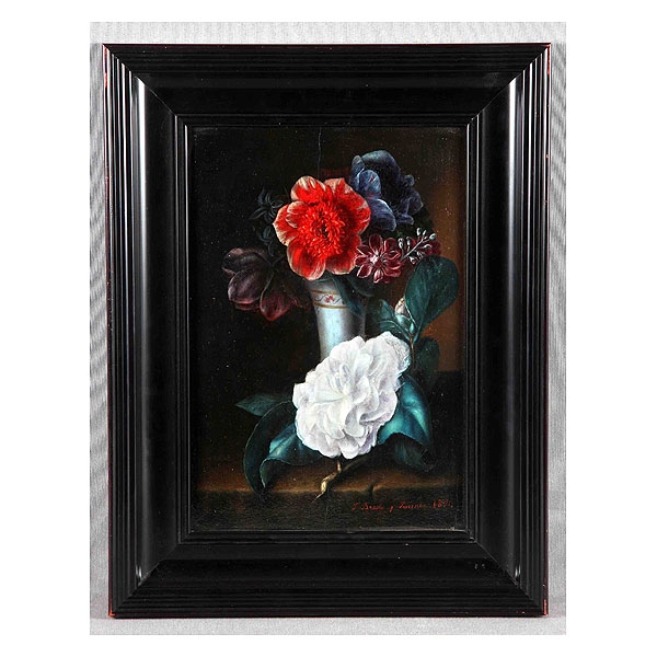 BRACHO MURILLO, JOSÉ Mª (1827-1882). “Jarrón con flores y gardenia”. Óleo sobre tabla, de 34x23 cm.