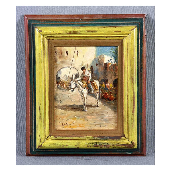 NAVARRO LLORENS, JOSÉ (1867-1923). “Vista rural con personaje y burro”. Óleo sobre cartón, de 23x18 cm. Firmado. (Estado de conservación: con ligero desperfecto en el soporte).
