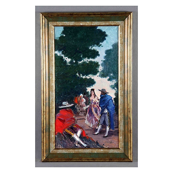 TERRUELLA MATILLA, JOAQUÍN (1891-1957). “Maja y embozados”. Óleo sobre lienzo pegado a tabla, de 63x34 cm. Firmado.