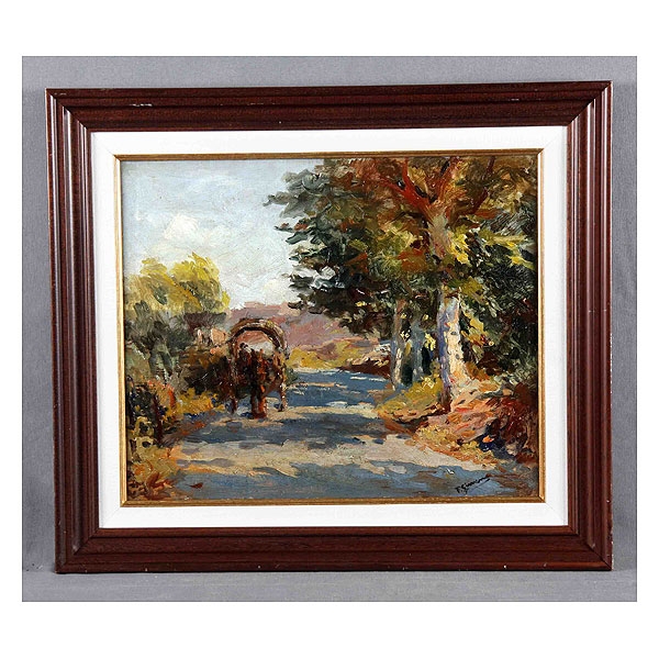 GIMENO, FRANCISCO (1858-1927). “Paisaje con carruaje”. Óleo sobre lienzo, de 39x47 cm. Firmado.