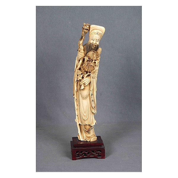 Escultura china, años 40-50, representando a un dignatario con vara de la longevidad en marfil tallado.