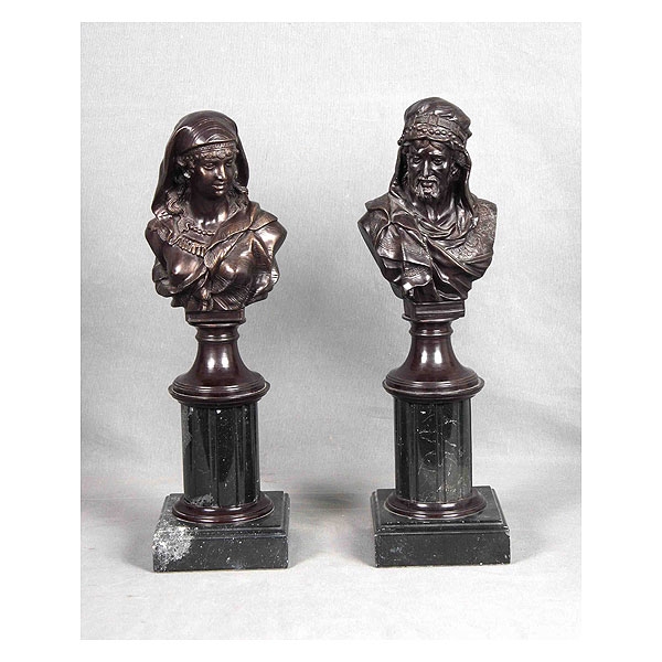 ANÓNIMO. "Busto de mujer y hombre árabes". Pareja de esculturas en bronce patinado.