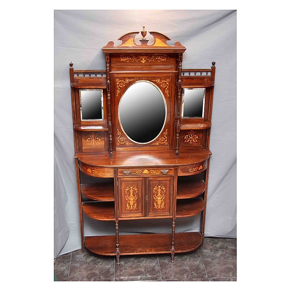 Aparador inglés de época Eduardiana, años 1890-1900, en madera de palisandro y marquetería de limoncillo, con dos puertas y cajón central.