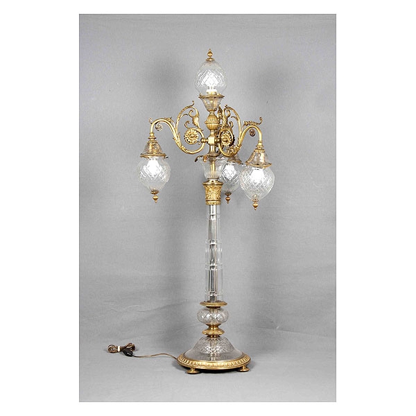 Lámpara filipina de pie, S.XIX, en bronce dorado y cristal tallado, con tres brazos y cuatro puntos de luz. Alt.: 112 cm.