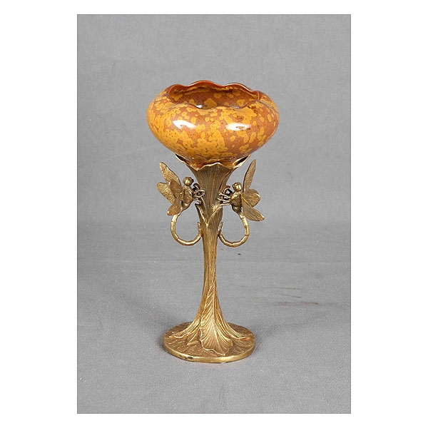 Centro modernista en cerámica y bronce, con decoración de libélulas. Alt.: 25 cm.