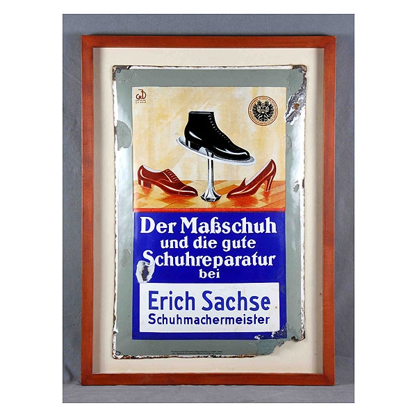 Cartel publicitario de zapatero alemán "Der Mabschuh und Die Gute Schuhreparatur Bei Erich Sachse, Schuhmachermeister”, en chapa esmaltada policromada.