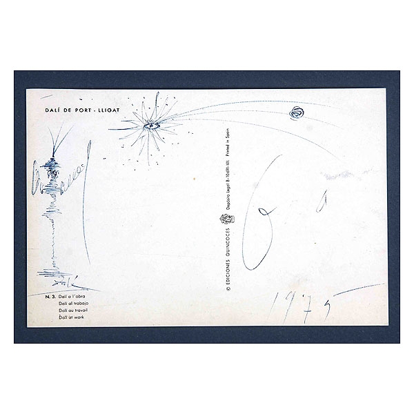 Dibujo a tinta sobre tarjeta postal, de 10x15 cm. Con dedicatoria del artista a su esposa Gala. Firmado y fechado 1975.