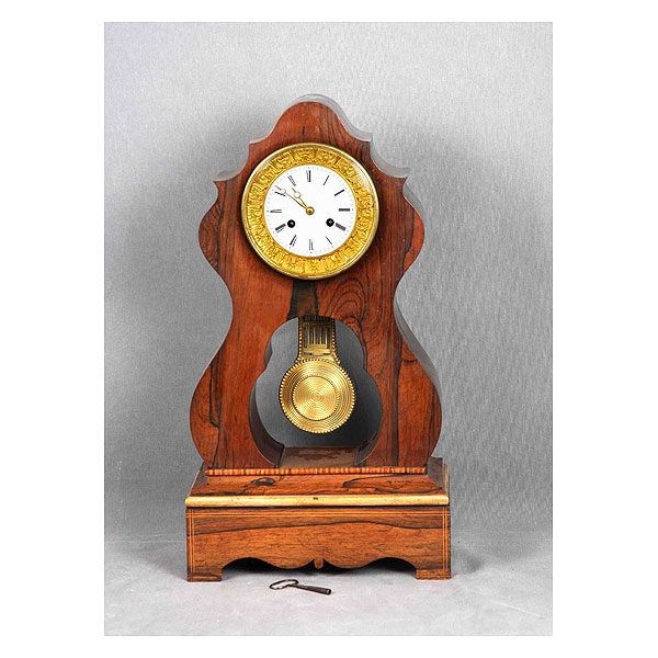 Reloj de pórtico en madera de palisandro con esfera circular blanca y bronce dorado con péndulo tambien en bronce dorado.
