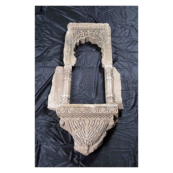 Ventana india, S.XVI-XVII, en piedra caliza. Formada por basamento, pareja de columnas y dintel, con decoración de motivos y geométricos florales. Med.: 133x62x17 cm.