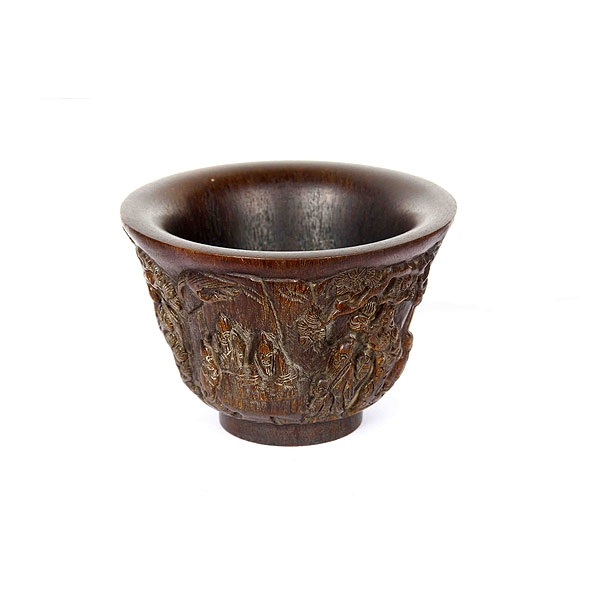 Copa de libación tallada en cuerno de rinoceronte, S.XIX, decorada con escenas de inmortales y paisajes en relieve. Tradicionalmente al cuerno de rinoceronte se le otorga un carácter protector ante las fuerzas oscuras.