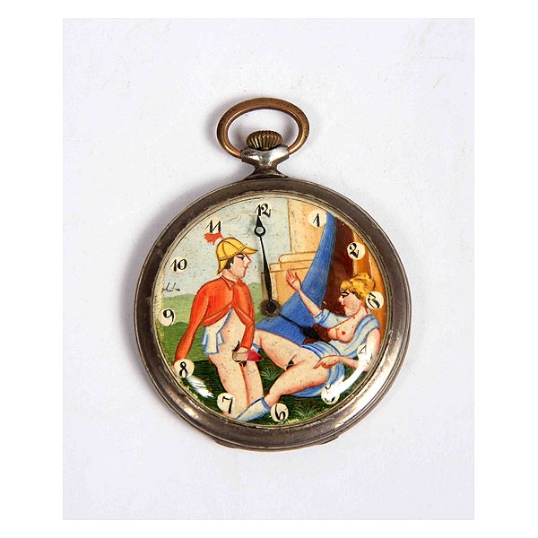 Reloj erótico de bolsillo en plateado. Esfera con números árabes.