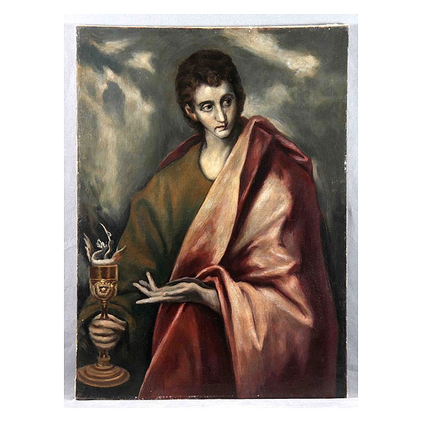 Esta obra representa precisamente la figura de San Juan Evangelista, y procede de una colección privada española, herencia patrimonial sucesoria del General Castaños, militar vencedor de los franceses en la histórica batalla de Bailén durante la Guerra de la Independencia.