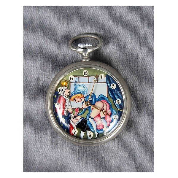 Reloj autómata de bolsillo, en plateado. Esfera decorada con escena erótica y numeración árabe.