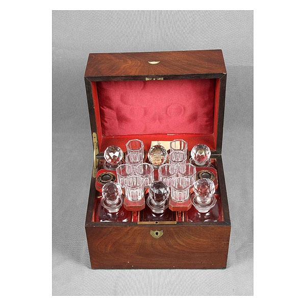 Caja licorera, estilo Napoleón III, en caoba y cristal tallado, con seis licoreras y diez vasitos.