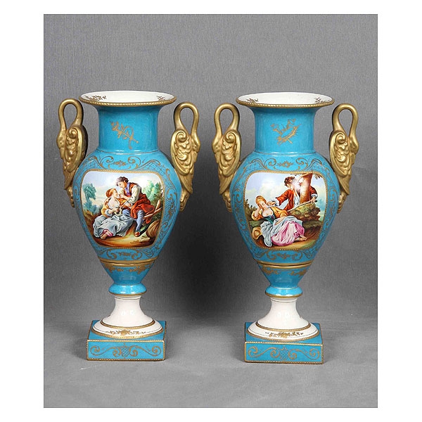 Pareja de jarrones de estilo francés, en porcelana de color azul celeste, decorados con medallones centrales con escenas galantes y motivos vegetales en dorados.