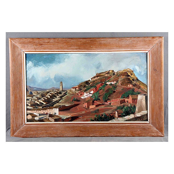 PÉREZ GIL, JOSÉ (1918-1998). “Castillo de Monóvar”. Óleo sobre lienzo, de 46x81 cm.