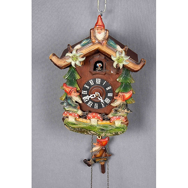 Antiguo reloj de cuco infantil, de la marca COPPEL, con cuerpo en madera tallada y policromada, representando casita de gnomos, y péndulo con figura de gnomo.