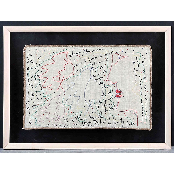 386 Publicado en GALILEO. Subasta 28 Mayo 2019 tamaño de la fuente disminuir el tamaño de la fuente aumentar tamaño de la fuente Imprimir Compartir ALBERTI, RAFAEL."Palomas y rostro con poema".Tinta sobre tela, de 27,5x42 cm. Fechado 1969, firmado y dedicado a Elena. Información adicional Precio de salida: 550 € >>: PUJAR AQUÍ Tweet Etiquetado como DIBUJO Valora este artículo 1 2 3 4 5 (0 votos)