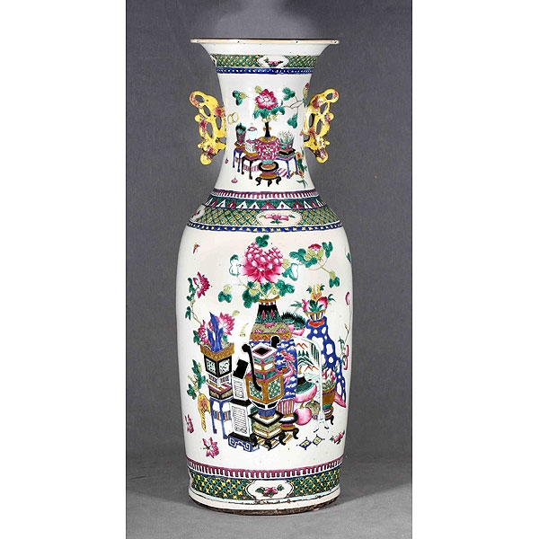 En porcelana, familia verde, policromada y decorada con escenas de pájaros y jarrones florales.