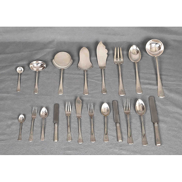 En plata punzonada, formada por 8 piezas de servir; 12 cucharas, 24 tenedores y 24 cuchillos de mesa; 12 tenedores y 12 cuchillos de pescado; 12 cucharas, 12 tenedores y 12 cuchillos de merienda; 12 cucharas, 12 tenedores y 12 cuchillos de postre; y 12 cucharillas de café.