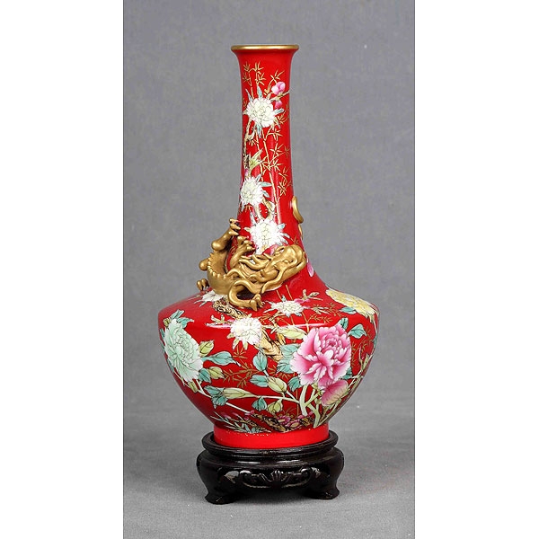 En porcelana policromada y decorada con figura de dragón en relieve y motivos florales, sobre peana de madera.