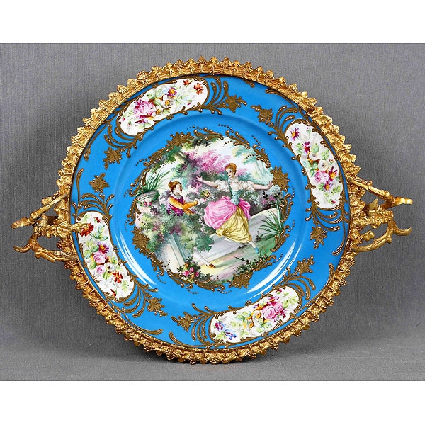 En bronce dorado al mercurio y porcelana policromada. Campo central decorado con escena galante, ala con medallones de motivos florales rematada con orla dorada y grecas vegetales.