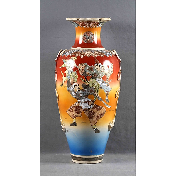 En porcelana SATSUMA, con decoración de guerreros samurais, medallones y motivos geométricos en relieve. Asas en forma de argolla.
