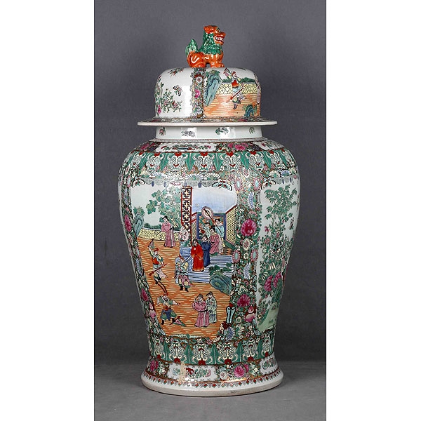 En porcelana policromada, decorada con escenas y motivos florales. Tapa rematada con perro foo. Marcas en la base.
