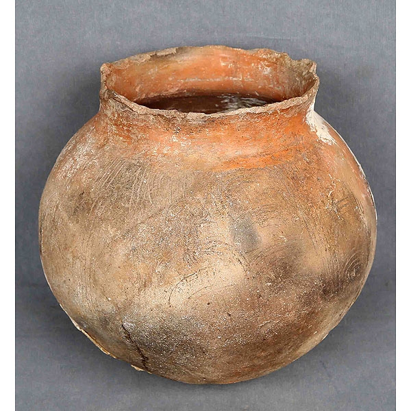En barro cocido, decorado con motivos geométricos incisos. Pieza hallada en cueva natural en la zona del Altiplano de Guatemala, presentado restos de estalagmita adherida.