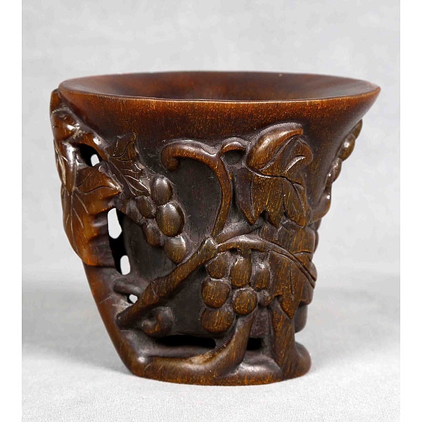 Con decoración de motivos alegóricos en relieve, relativos a la vid. Sello en la base. Los elementos decorativos de este tipo de piezas están vinculados a un simbolismo mágico. Tradicionalmente al cuerno de rinoceronte se le otorga un carácter protector ante las fuerzas oscuras.