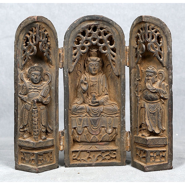Tríptico de viaje chino, con figura de Buda en capilla central, flanqueado por 2 samurais.