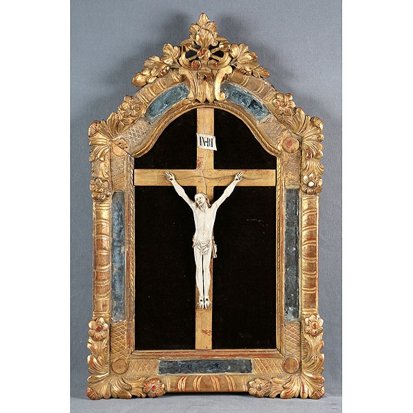 En marfil tallado. Marco en madera estucada, decorada con espejos y dorada al oro fino.