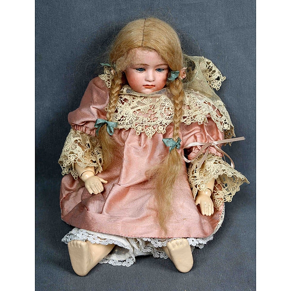 Con cabeza en porcelana policromada, con boca cerrada y ojos móviles, con vestido de tela y encaje y pelo natural.