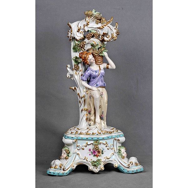 Escultura en porcelana policromada, representando a vendimiadora bajo parra con cesto de uvas y decoración de motivos florales.