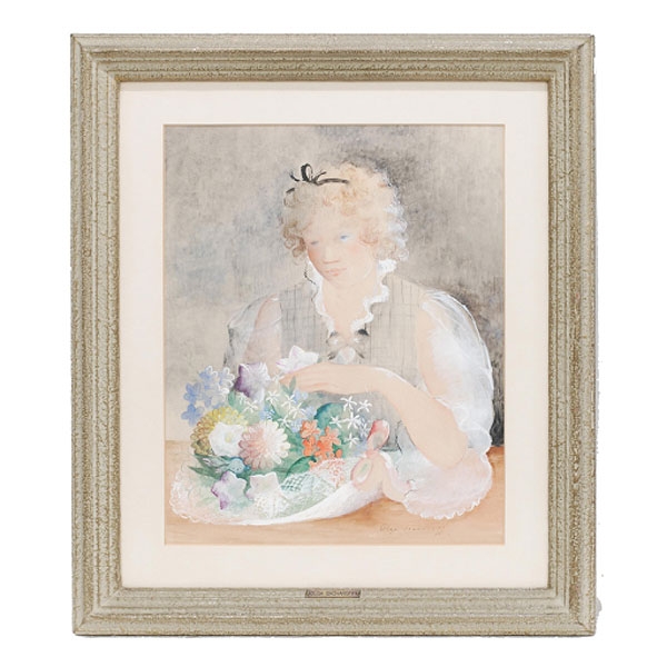 OLGA SACHAROFF (1889-1967).. "Joven con flores" Gouache sobre cartón. Firmado y fechado en el ángulo inferior derecho, 1917. Expuesto en la exposición "Olga Sacharoff: pintura, poesia i emancipació" en el Museo de Arte de Girona.