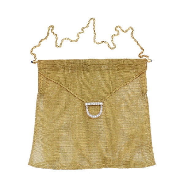 BOLSO EN MALLA DE ORO Oro vistas oro blanco, cierre con diamantes talla brillante de un peso total aprox. de 0,77 ct.
