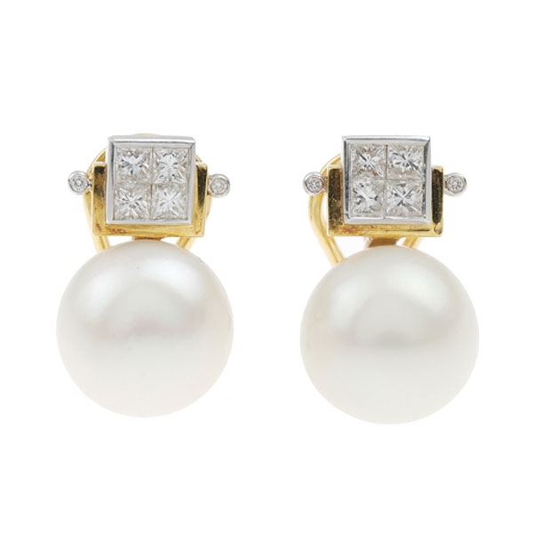 PUIG DORIA. PENDIENTES EN ORO, DIAMANTES Y PERLA AUSTRALIANA Oro amarillo con vistas oro blanco con diamantes talla princesa y talla redonda de un peso total aprox. de 2,50 ct. y perla australiana de un diámetro aprox. de 1,8 cm.