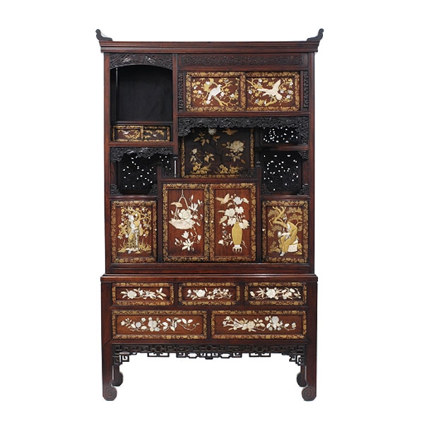 Diferentes apartamentos con cajones y puertas correderas que representan personajes, flores y pájaros. Consta de dos cuerpos. Algunos desperfectos.