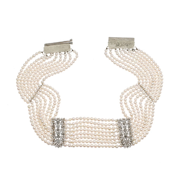 COLLAR DE PERLAS Y BRILLANTES BELLE ÉPOQUE Ocho tiras de perlas cultivadas y oro blanco bajo de 585 mm. Decoración floral con diamantes talla rosa