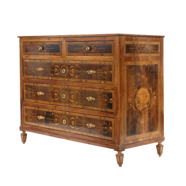 CÓMODA MALLORQUINA CARLOS IV, FINALES SIGLO XVIII En nogal y palisandro con marquetería de maderas finas. Bocallaves y tiradores de época posterior.