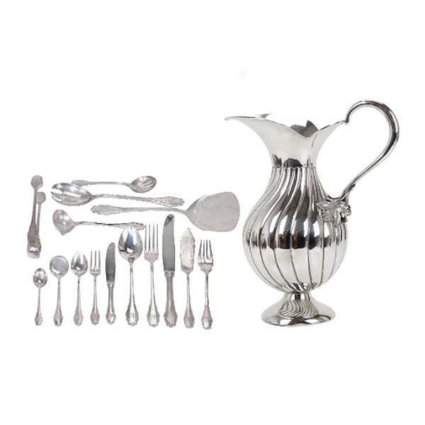 CUBERTERÍA ESPAÑOLA DE DOCE SERVICIOS Y JARRA GALLONADA EN PLATA, MEDIADOS SIGLO XX