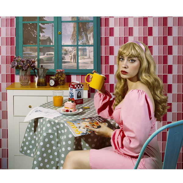 SOBRE LA OBRA: En esta obra, vemos a una mujer con una apariencia dulce e inocente disfrutando de un desayuno tranquilo en la cocina de su hogar. El escenario parece formar parte de una casa de muñecas: dulces en la cocina, colores pastel... Sin embargo, si prestamos atención a los detalles, encontramos una serie de señales de advertencia. En la mesa hay un cartel de "Se Busca" con un retrato robot de un criminal, el cartón de leche muestra la fotografía de una niña desaparecida, y, al mirar por la ventana, observamos una escena de un vecindario residencial típicamente estadounidense, aparentemente pacífico, donde un hombre que encaja con la descripción del sospechoso está hablando con una niña. Mientras tanto, la mujer que desayuna está leyendo una revista titulada "Gossip", con el subtítulo "La revista para las chicas buenas". En la portada se destaca un titular que anuncia un artículo con consejos para hacer feliz a tu esposo. A pesar de estar en un entorno idílico y aparentemente seguro, la mujer parece distraída. Los detalles a su alrededor revelan que el peligro está presente, y algo fuera de cuadro ha captado su atención.