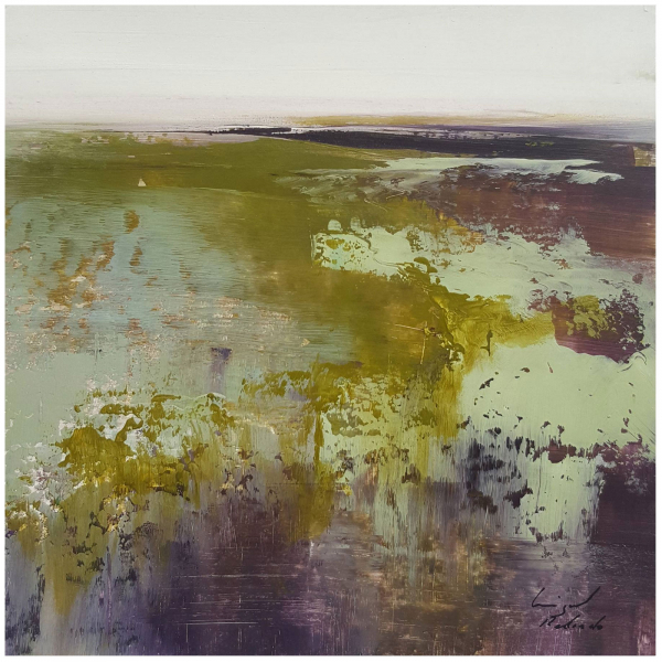 Miguel Redondo (Langreo, Asturias, 1971). Su obra "Esencias 7", del año 2020, está realizada en acrílico sobre cartón pegado en DM y sus medidas son 23x23cm (ancho x alto).