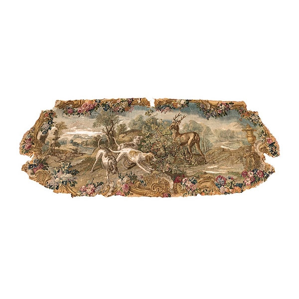 Tapicería francesa para respaldo de un canapé de punto de tapiz con escena de caza y orla de flores, Manufactura de Beauvais según modelos de Jean-Baptiste Oudry, S.XVIII. Faltas