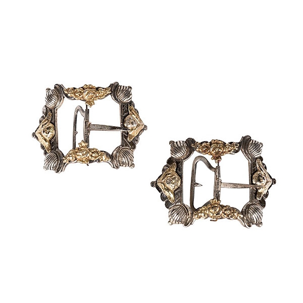 Pareja de hebillas españolas para zapato de plata en su color y dorada con veneras y querubines, S.XVIII. Marcas posiblemente de Córdoba y de platero Hernandez.